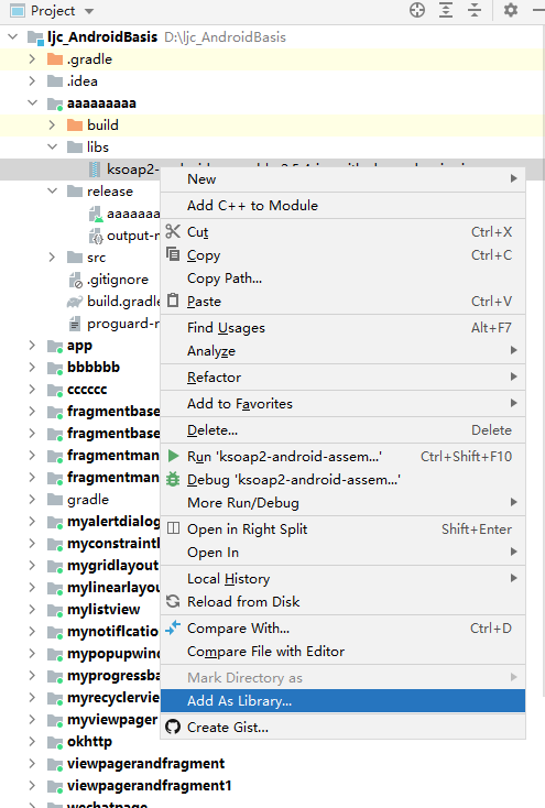首先将本地的jar包放在项目下的\app\libs文件里面,然后右键放进去的jar包选择Add As Library…选项